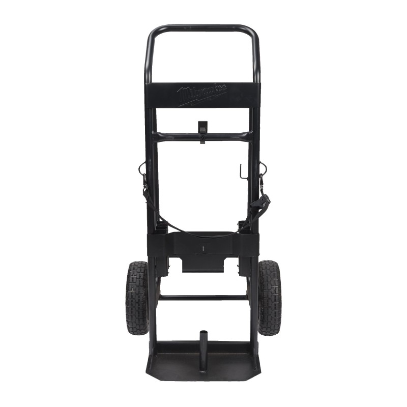 Carro de transporte ligero para martillo demoledor con ruedas de goma de grandes dimensiones para facilitar su transporte en terrenos desnivelados | Correas para sujeción del martillo integradas y puntos de enganche completamente metálicos | Capacidad para transportar 4 cinceles y un cargador, con gancho incorporado para almacenamiento del cable del cargador | Almacenamiento para batería y cargador con gancho para el cable del cargador para facilitar el transporte