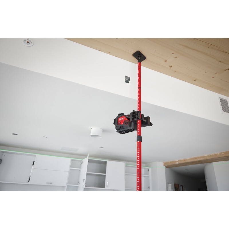 El puntal telescópico para nivel láser MILWAUKEE® extensible hasta 3,6m es ideal para instalar niveles láser de líneas incluso en techos altos | El cabezal giratorio con muelle facilita la instalación, incluso en superficies irregulares | La abrazadera de liberación rápida incluida se abre hasta 6,3cm y puede fijarse a materiales redondos y cuadrados | Todos los niveles láser MILWAUKEE® se pueden montar en la pinza utilizando los imanes de neodimio integrados en el soporte | Las marcas de verificación ayudan a identificar la posición correcta del nivel láser