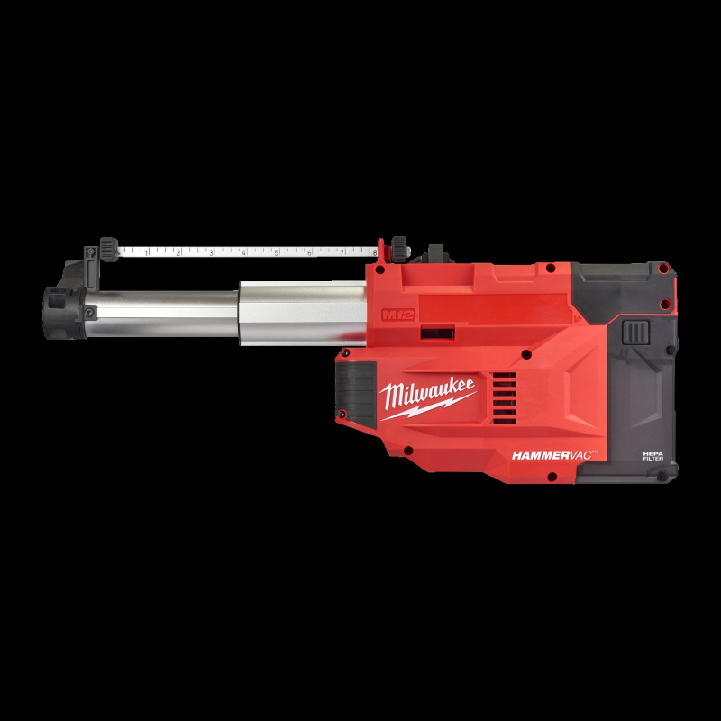 Se adapta a todos los martillos MILWAUKEE® SDS-Plus y a la mayoría de los martillos de la competencia entre 41mm y 61mm de tamaño de cuello con solo un mango lateral ajustable que se puede montar a la derecha o izquierda del martillo | Más de 40 minutos de autonomía con una batería M12™ de 2.0Ah | Gracias a la boquilla telescópica es capaz de funcionar con brocas SDS-Plus de hasta 210mm de longitud | Medidor de profundidad de perforación ajustable para un ajuste perfecto a la tarea | 2 boquillas intercambiables con cepillos para cubrir diámetros de perforación hasta ⌀30mm (⌀5-16mm, ⌀16-30mm) | 2 modos de aspiración para encender la unidad permanente o activarla automáticamente cuando empieza la perforación | Retraso de 5 segundos después de apagarlo para seguir aspirando el polvo sobrante | Equipado con un filtro HEPA H13 así como un mecanismo de limpieza del filtro para un mejor rendimiento y una vida útil más prolongada del filtro | Equipado con un tanque transparente para una visibilidad de la capacidad total, así como un conector de aspiración de ⌀32 mm para vaciar el depósito de polvo sin exposición al polvo | Indicador del nivel de carga de la batería