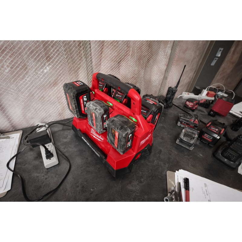 Compatible con todas las baterías M18™ | Carga 2 baterías simultáneamente a una velocidad de carga rápida | 6 puertos M18™ | Totalmente compatible con el sistema de almacenamiento modular PACKOUT™ | Carga dispositivos electrónicos personales a través de un puerto USB-A de 2,4A | Almacena los dispositivos personales en los huecos laterales de almacenamiento | Inteligencia REDLINK™: Optimiza las tasas de carga en función del tipo de batería y la temperatura para minimizar la duración de la carga y maximizar la vida útil de la batería | Cómoda asa de transporte | Carga 6 baterías de 5.0Ah M18™ en 3 horas | Compatible con todos los productos PACKOUT™