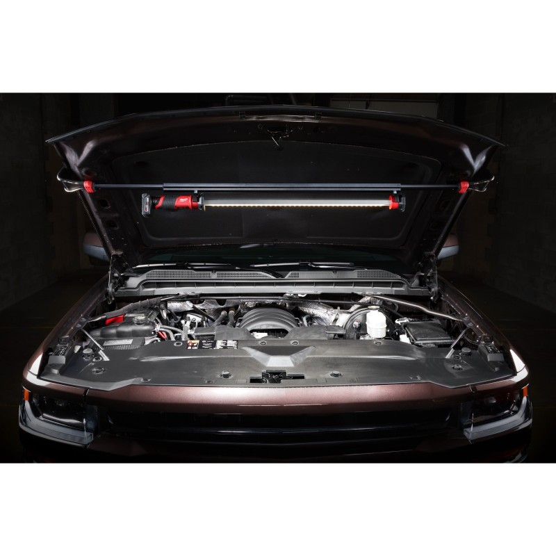 Linterna de alta potencia TRUEVIEW™ que proporciona un haz de luz constante, temperatura y color optimizado. Luz real, lo que mejora la visión correcta de los colores y los detalles | Dos niveles de iluminación, 1.350 y 600 lúmenes para maximizar la autonomía y optimizar la iluminación | La batería M12™ de 4.0Ah proporciona una autonomía de 4 horas en la posición alta y 8 horas en la configuración baja | Los ganchos de fijación se abren de 119cm a 196cm, pudiendo ser utilizado en coches anchos incluso camionetas | Barra de iluminación flexible y versátil, rotación vertical, posición de ajuste y desmontable para ajustarse a las necesidades del usuario | Superficie engomada para un mejor agarre | Ganchos MILWAUKEE® FINISHGUARD™ que protegen contra arañazos en la carrocería del vehículo | El gancho inoxidable permite fijar la barra de luz independientemente del soporte | El marco fabricado en aluminio de calidad aeronáutica asegura la máxima durabilidad | Lente de policarbonato resistente a impactos y químicos para soportar los fluidos de automoción más comunes | Clasificación IP54: protección contra el polvo y salpicaduras de agua | Sistema flexible de batería: funciona con todas las baterías MILWAUKEE® M12™