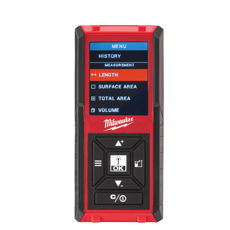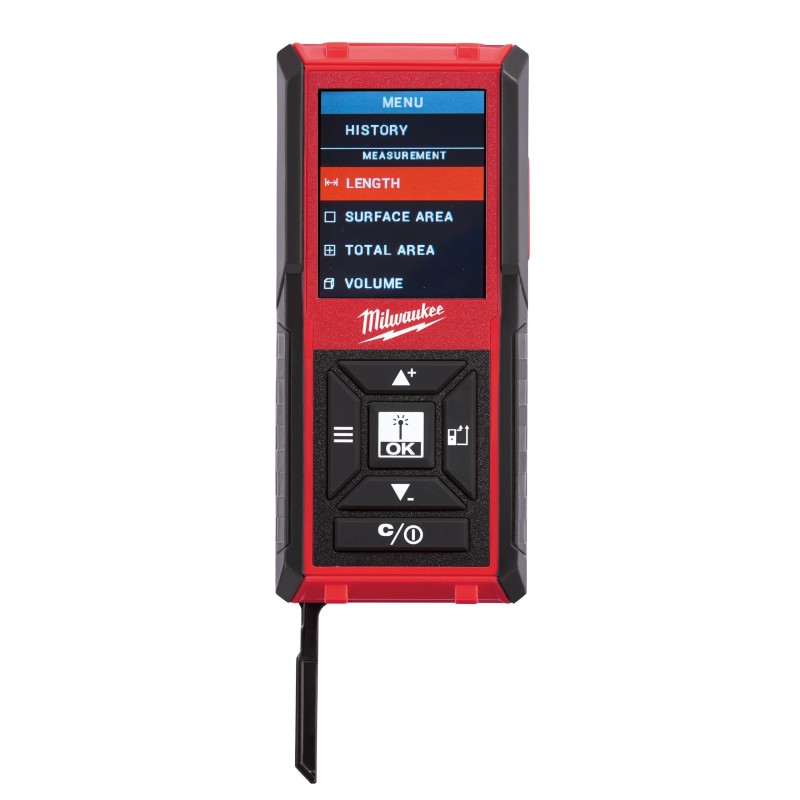 Fácil de usar por una persona, sistema de apuntar y medir | IP54: protección frente al agua y al polvo | Unidades de medida: métrica e imperial | Todos los botones de medición a mano, tanto en el frente como en el lateral de la carcasa | Permite al usuario realizar mediciones individuales y seguimiento continuo | Ofrece varias funciones de medición diferentes que permiten a los usuarios sumar y restar valores, calcular la distancia lineal, perímetro, área total y volumen | Gran pantalla de 3 líneas de 50mm de diámetro. Pantalla LCD multicolor para una visibilidad optimizada | La pantalla muestra las tres últimas mediciones y el historial muestra las últimas 30 mediciones | Bisagra de 2 posiciones para medir fácilmente desde las esquinas | Función de autoapagado e indicador de batería baja | Carcasa delgada para una fácil manipulación y bolsa de transporte de nailon para un transporte seguro