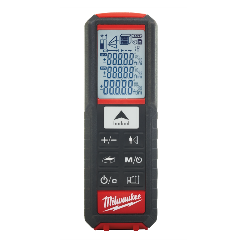 Fácil de usar por una persona, sistema de apuntar y medir | Diseño de la carcasa muy compacta con clip de cinturón para un transporte más fácil | Área/ volumen/ medida indirecta de altura y superficie indirecta | Función de barrido mín./ máx. y seguimiento continuo | Añadir y borrar mediciones | Medición indirecta (Pitágoras 2 puntos, 3 puntos y medición parcial) | Pantalla gráfica LCD de 3 líneas de grandes dimensiones de fácil lectura con retroiluminación blanca automática | Pieza basculante en la base de la máquina para hacer mediciones en bordes o esquinas | Memoria de las 20 últimas mediciones | IP54: protección contra el agua y polvo | Auto desconexión e indicador de carga | Medición solo en métrica